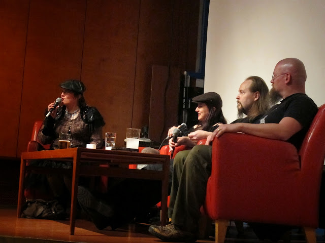 Kunniavieras Hal Duncanin haastattelu oli aika huimaa kuunneltavaa, mutta kirjailijan voimakas skottiaksentti, lennokkaat jutut ja huono ennakkotietämykseni hänen tuotannostaan tekivät sen seuraamisesta hyvin haastavaa. Lähinnä hän kertoili kirjoittamistaan inspiroineista teoksista, kirjoittamisprosessistaan, suhteestaan New Weirdiin ja fantasia/sf jakoon, sekä kirjoittamistaan musikaaleista. Hän myös lauloi otteita Sodom! The Musicalista. Harva pystyi pitämään pokkansa "Comfort My Cunt" kappaleen aikana. xD